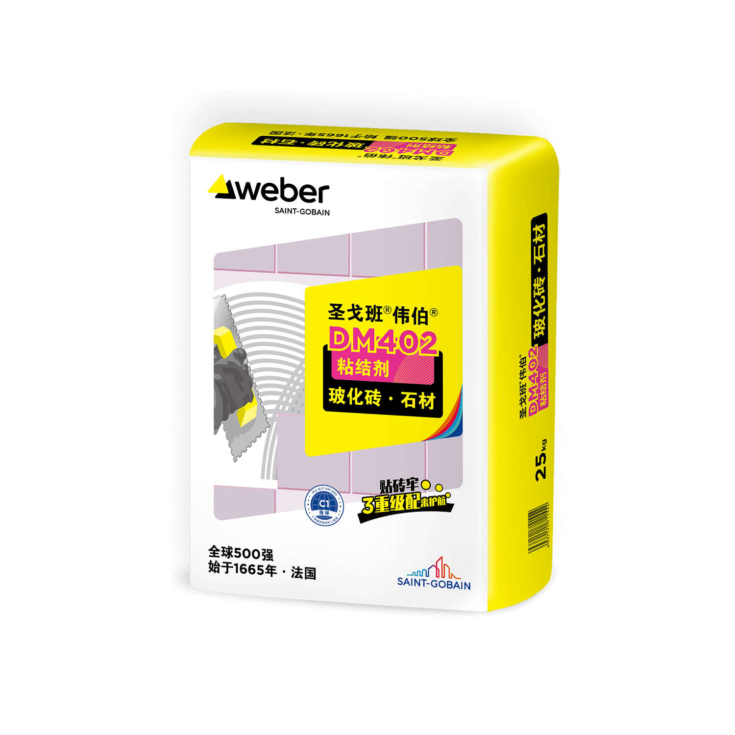 圣戈班®伟伯®DM402是水泥基聚合物改性瓷砖粘结产品,可满足玻化砖、石材的粘贴,采用圣戈班®伟伯®三重级配配方,具有高保水、高满浆、高强度、耐温耐冻等特点,更通过法国室内环境检测A+认证,环保升级,全面有效的保护家居装饰和家庭健康。