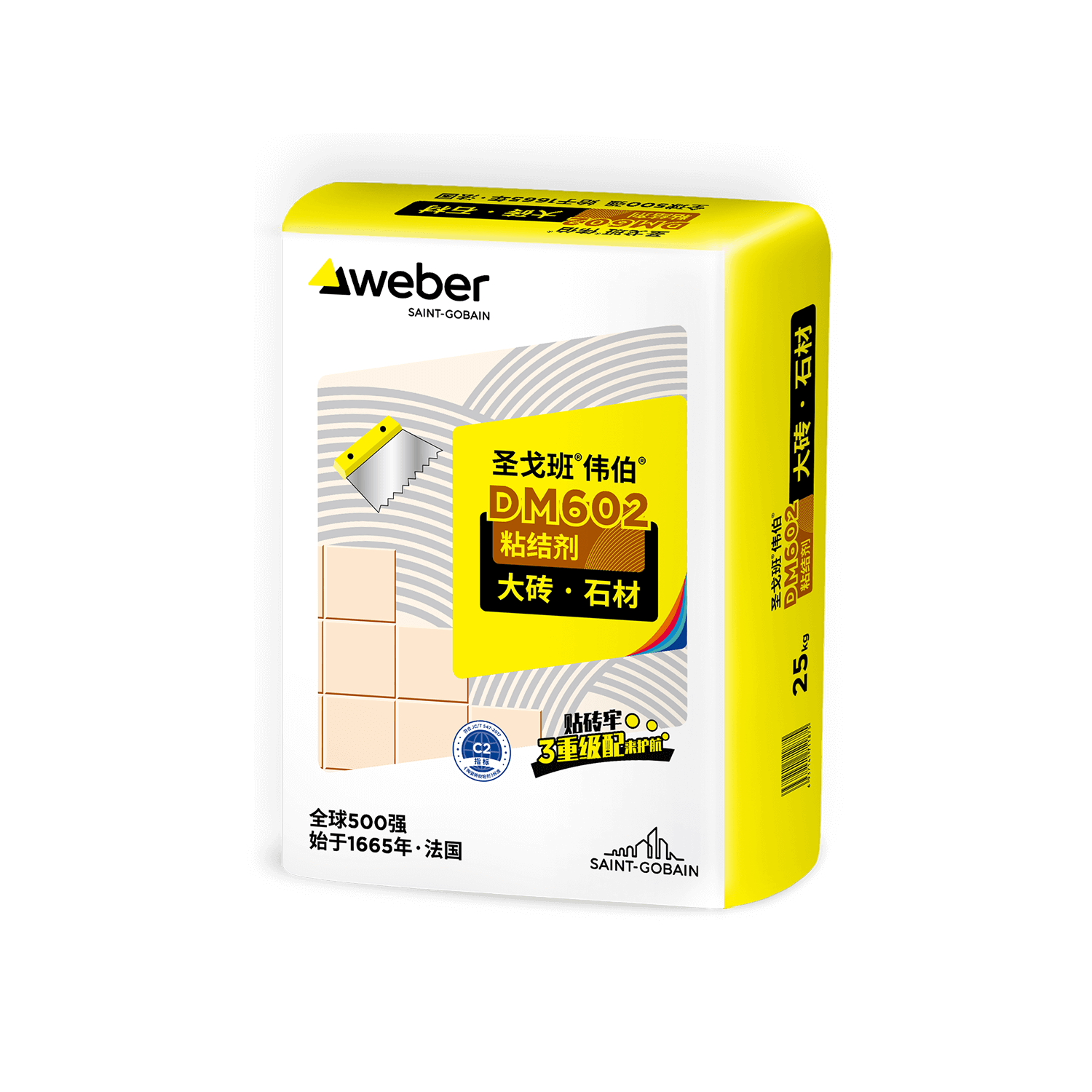 圣戈班®伟伯®DM602是水泥基聚合物改性瓷砖粘结产品,可满足大砖、石材的铺贴,采用圣戈班®伟伯®三重级配配方,具有高保水、高满浆、高强度、易揉压调整等特点,更通过法国室内环境检测A+认证,环保升级,全面有效的保护家居装饰和家庭健康。