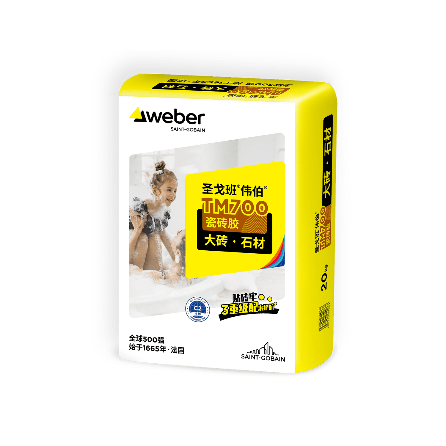 圣戈班®伟伯®TM700瓷砖胶是水泥基聚合物改性瓷砖粘结产品,可满足大砖、石材的铺贴,采用圣戈班®伟伯®三重级配配方,具有高保水、高满浆、高强度、易揉压调整等特点,更通过法国室内环境检测A+认证,环保升级,全面有效的保护家居装饰和家庭健康。