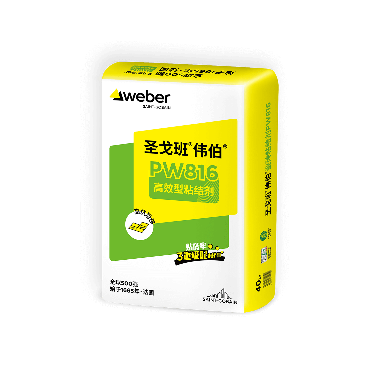 圣戈班®伟伯®高效型粘结剂 PW816是水泥基聚合物改性瓷砖粘结产品,可满足玻化砖、石材的粘贴,采用圣戈班®伟伯®三重级配配方,除了具有高保水、高满浆、高强度等特点,更优选高品质添加剂,产品强度更高,更抗滑移,施工手感更佳,通过法国室内环境检测A+认证和十环认证,全面有效的保护家居装饰和家庭健康。
