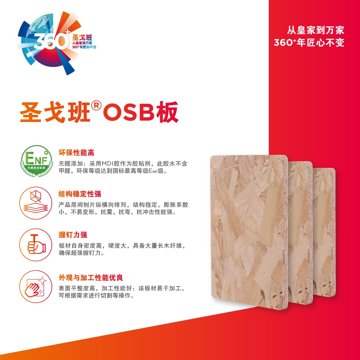 圣戈班OSB板 圣戈班®OSB板采用100%原木,生产原材料为杨木、松木或杉木,经去皮、刨片、热压加工而成。其定向结构重组了木材纹理结构,使其力学性能在方向性,耐久性,和稳定性上都有更好的保障。圣戈班®OSB板具有膨胀系数小,不变形,稳定性好,材质均匀,握钉力高,无醛环保等特点。