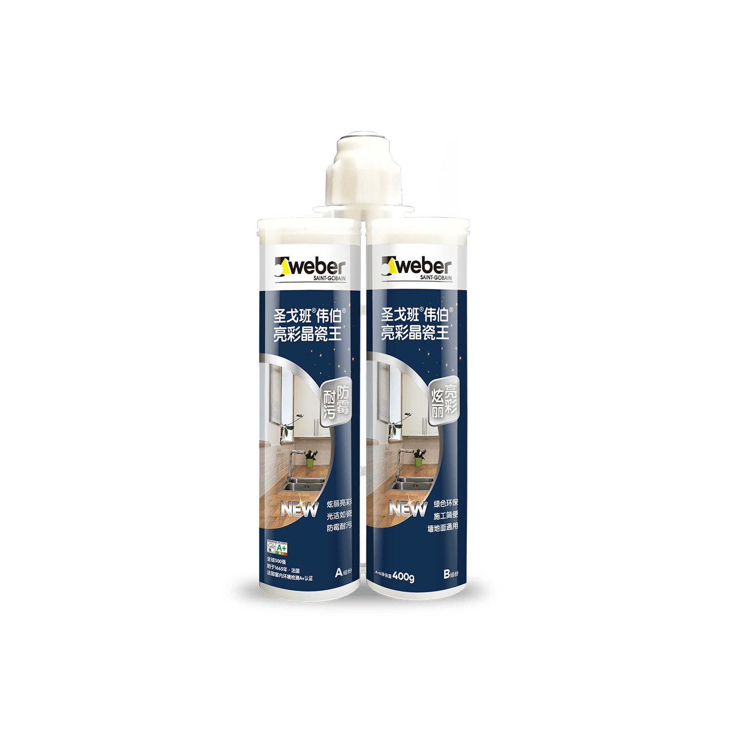 圣戈班®伟伯®亮彩晶瓷王是采用优质高分子环氧树脂、固化剂以及多种颜料共同组成的双组份美缝材料。该产品色彩丰富炫丽,固化后具有坚硬如瓷、防霉耐污等性能。施工操作简便,广泛用于陶瓷砖、马赛克、陶瓷卫浴产品完工后的缝隙填充美化,持久耐用。